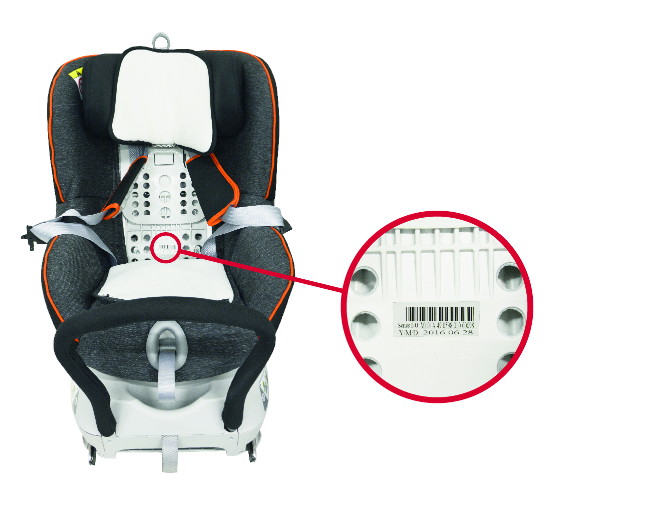Serienummeret ('Series NO. (serienummer)') er plassert foran på setet, under dekselet. Serienummeret starter med 'M101A', og etterfølges av 14 sifre. Illustrasjonene nedenfor viser deg hvordan du fjerner bilsetedekselet og finner serienummeret.