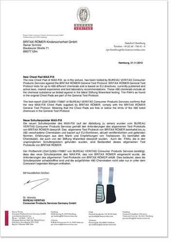 Den tyske forbrukerorganisasjonen Stiftung Warentest og den tyske bilorganisasjonen ADAC testet nylig 16 ulike bilbarneseter. I denne testen fikk Britax MAX-FIX (gruppe 0+/1, nyfødt til 18 kg) karakteren "god" når det gjelder sikkerhet, håndtering og ergonomi, men oppnådde bare totalkarakteren "mangelfull" siden det ble funnet stoffer i setet som kan være helseskadelige.